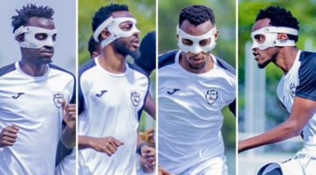 Abakinnyi bane ba APR FC ari bo Niyomugabo Claude, Byiringiro Jean Gilbert, Mugisha Gilbert na Hakim Kiwanuka bagaragaye mu myitozo bambaye ’masque’ zirinda izuru.