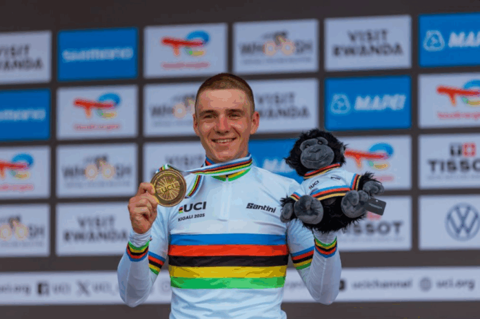 Umubiligi Remco Evenepoel wabaye umukinnyi wa gatatu mu mateka wegukanye Shampiyona y’Isi y’Amagare mu gusiganwa n’ibihe inshuro eshatu yikurikiranya, ni umwe mu bakinnyi banyuze mu yindi mikino irimo n’umupira w’amaguru.